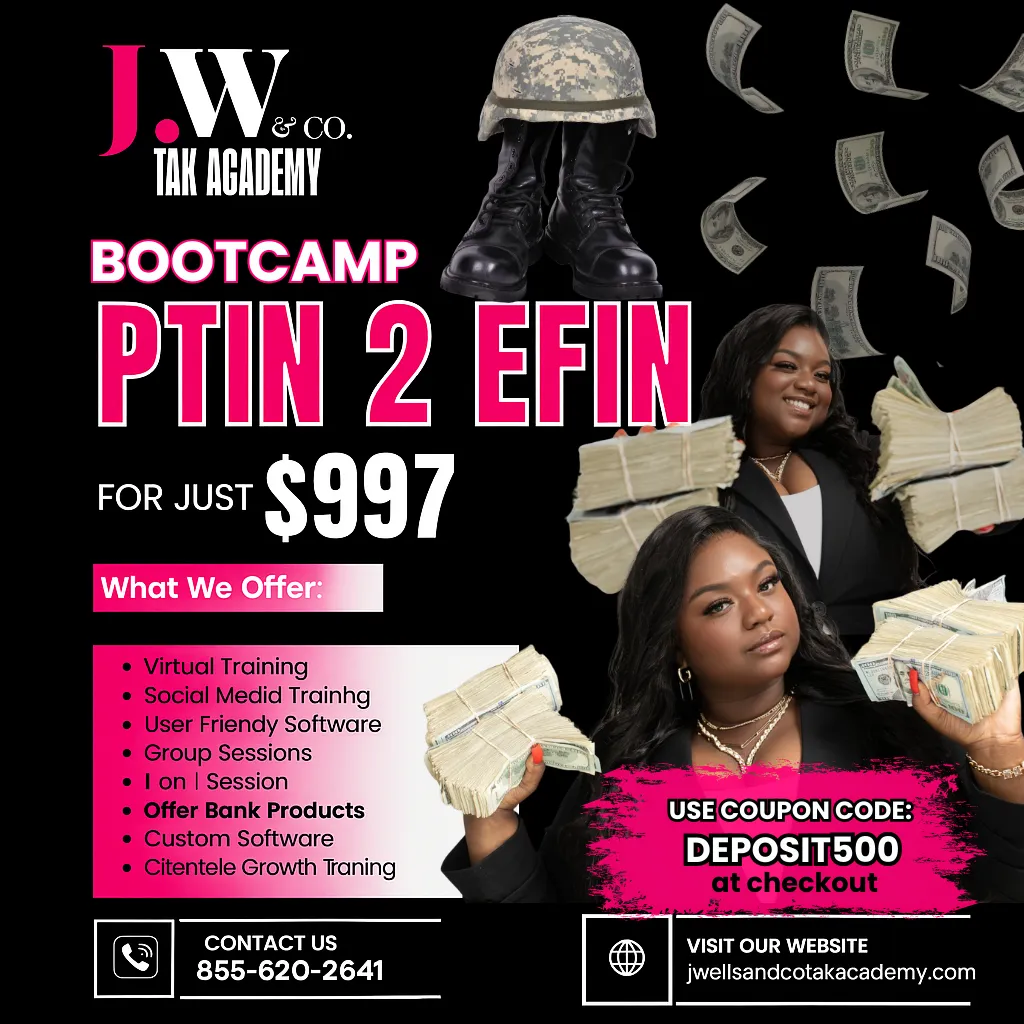 The PTIN to EFIN Bootcamp Starter Package is built for aspiring EROs ready to launch their own independent tax office. Priced a $1,997, Now only $997 this flat-fee package includes everything you need to go from setup to success — no revenue split required. You’ll receive professional tax software, EFIN and IRS registration assistance, personalized business setup, Custom branded marketing materials, full tech support, and weekly coaching. Plus, get access to your “Growth Blueprint” Ebook to scale confidently to 6 figures and beyond. This is the ultimate launchpad for new leaders in the tax industry.